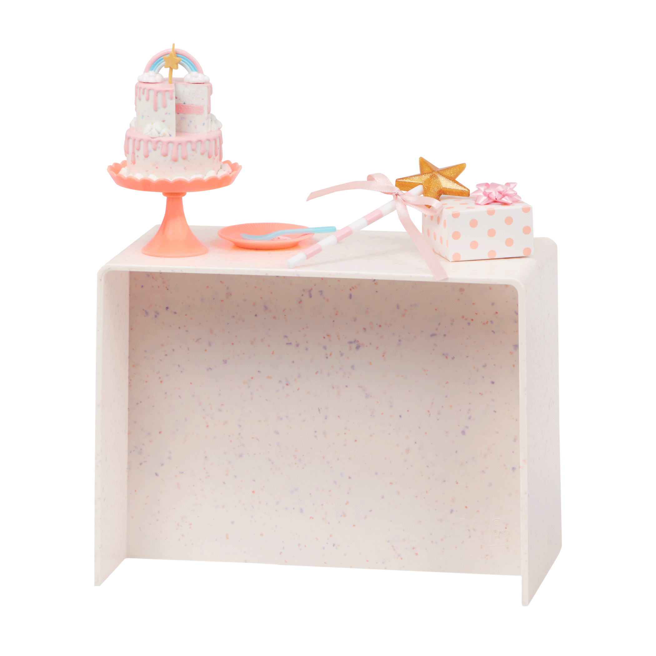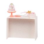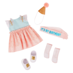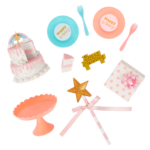 - Party Outfit & Accessories: Includes a cute party dress, a pair of undies, tall socks, shoes, party hat, birthday sash, wand, a two-tier celebration cake with a removable slice, cake stand, candle, cake topper, 2 plates, 2 forks, and a gift box.