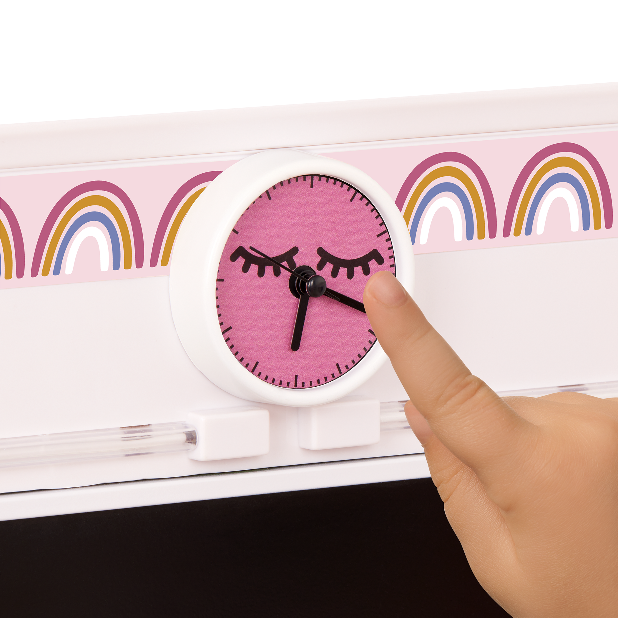 - Includes: Bedroom, bed, desk, chair, 2 blankets, 2 pillows, alarm clock, lamp, fishbowl, frame, eye mask, glasses, 2 sticker sheets, fidget toy, plant, toiletries, 2 treats, milk, wastebasket, pretend tablet, 3 pieces of chalk, and school supplies.