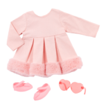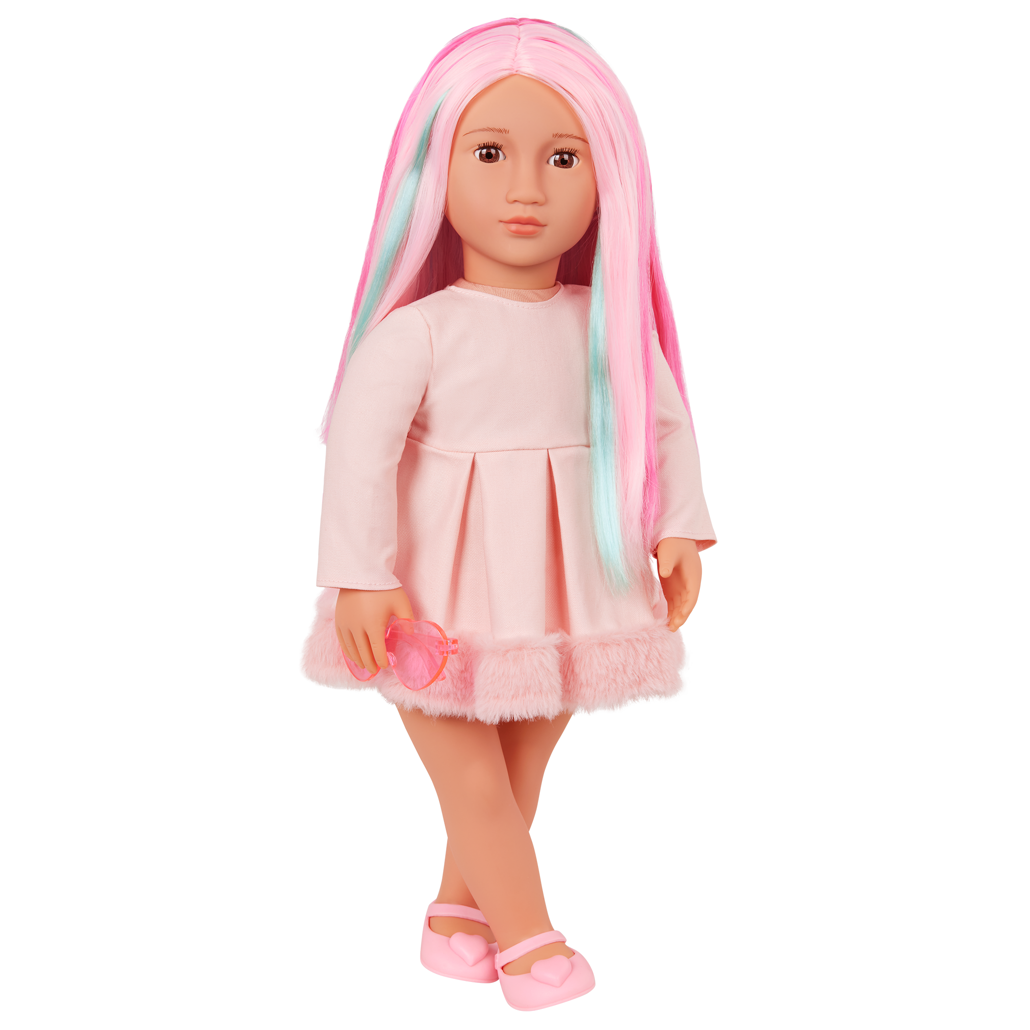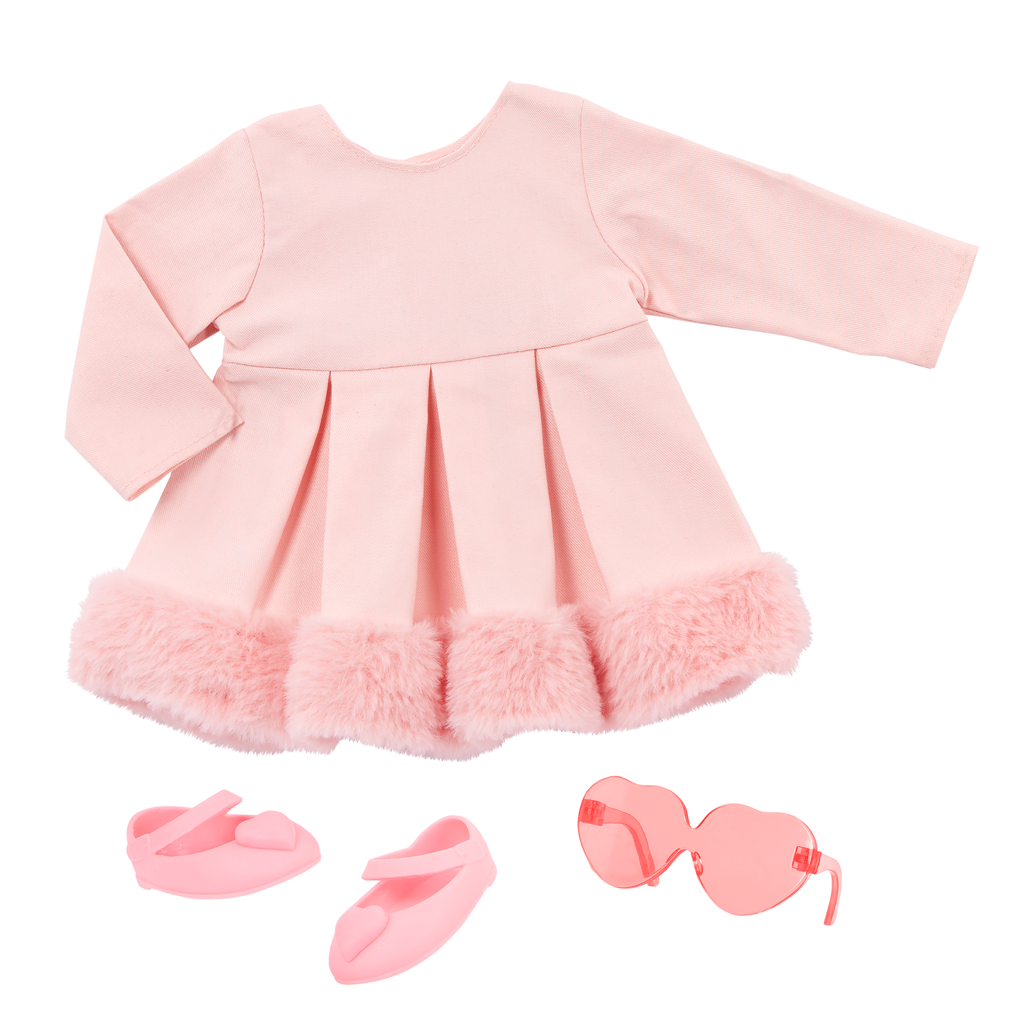 - Includes: doll, long-sleeve dress with a pretty faux-fur trim, pink heart-shaped glasses, a pair of undies, and shoes.