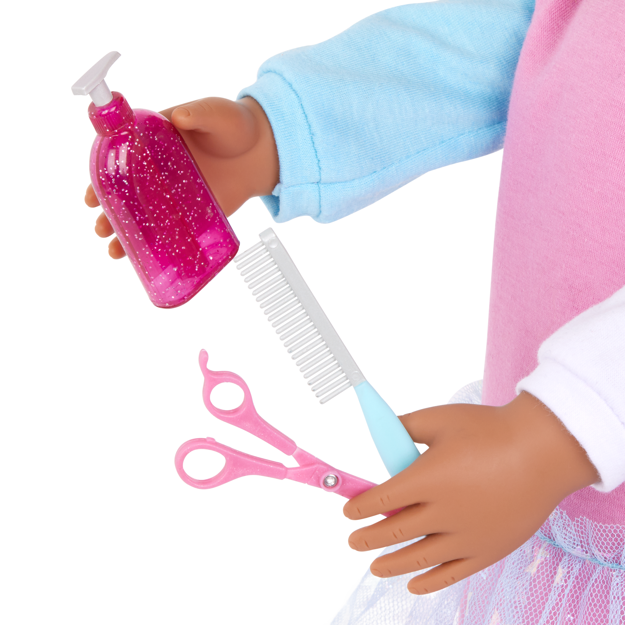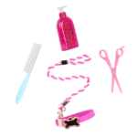 - Includes: Doll, a cute color block dress with a tulle skirt, a pair of undies, 2 tie-dye hair bows, shoes, socks, pretend scissors, shampoo bottle, 6-inch Barbet dog plush, dog collar, leash, and a comb.