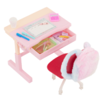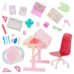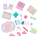 - Includes: Doll-sized desk, rolling chair, school bag, peelable stickers, light-up lamp, pretend laptop and calculator, geometry set with case, travel mug, glasses, planner, notebook, math book, pencil case, 11 school supplies. School bag colors may vary.