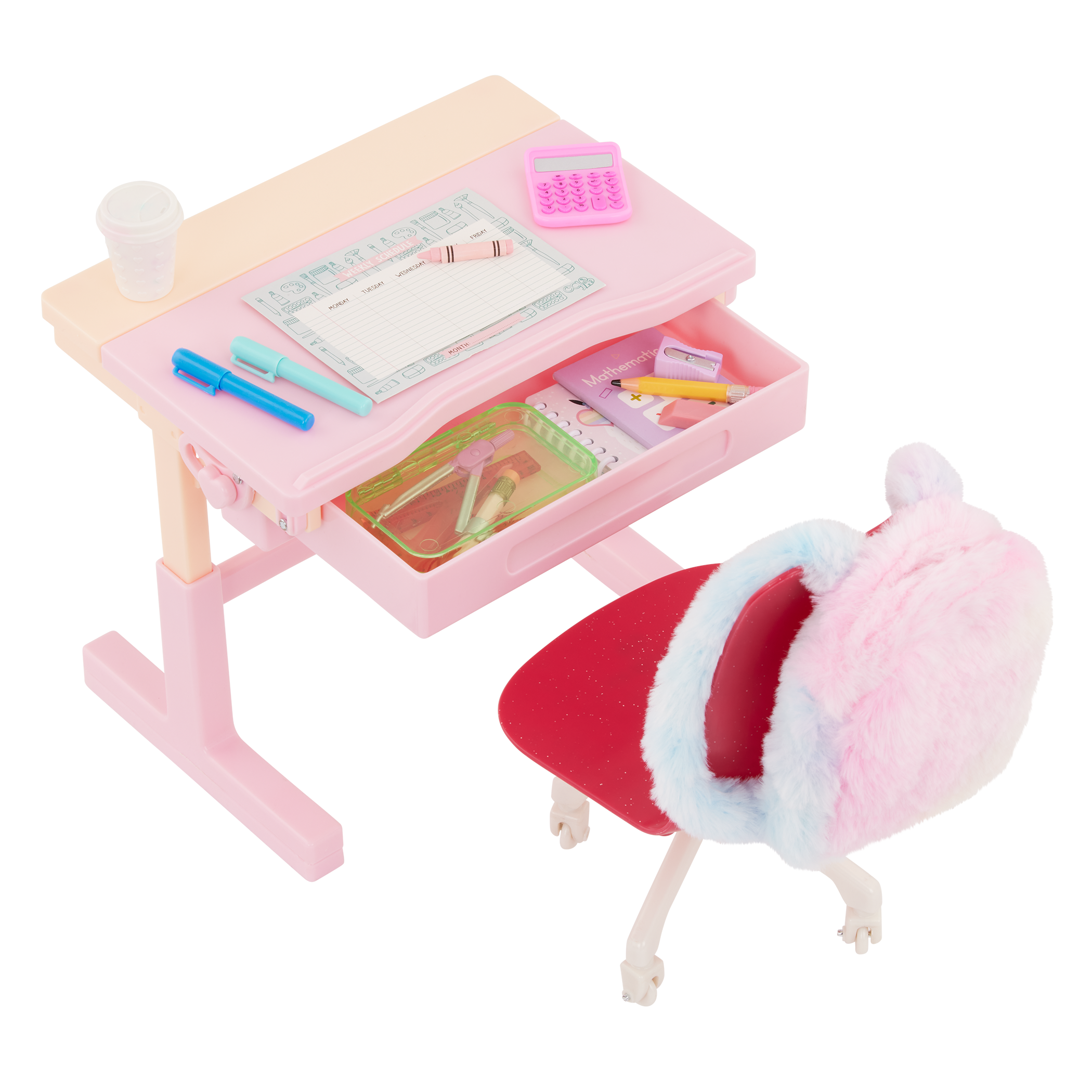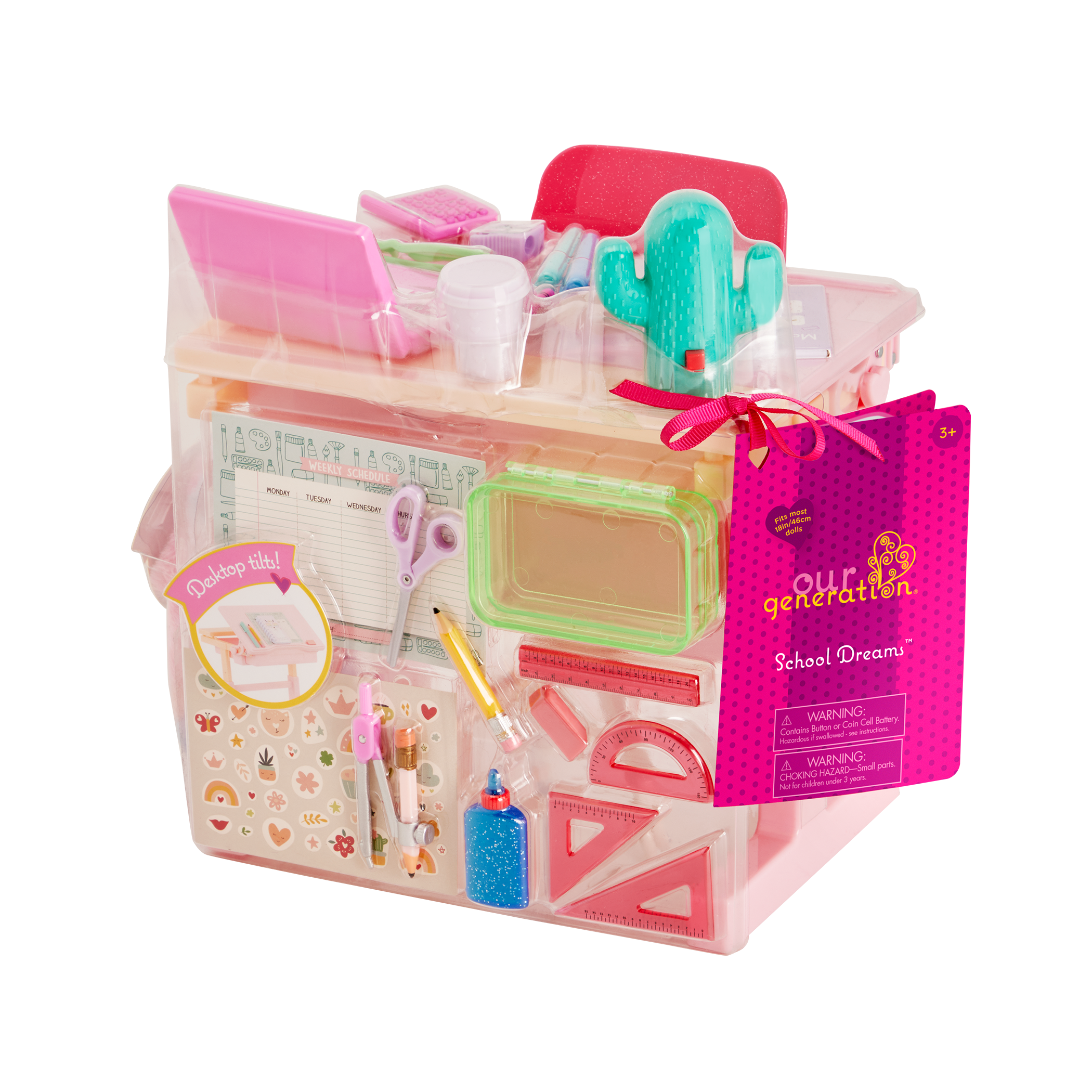 - 30-pc School Desk Set: Fans of school play will love setting up classrooms and home workspaces with the Our Generation School Dreams desk and chair set for 18-inch dolls!