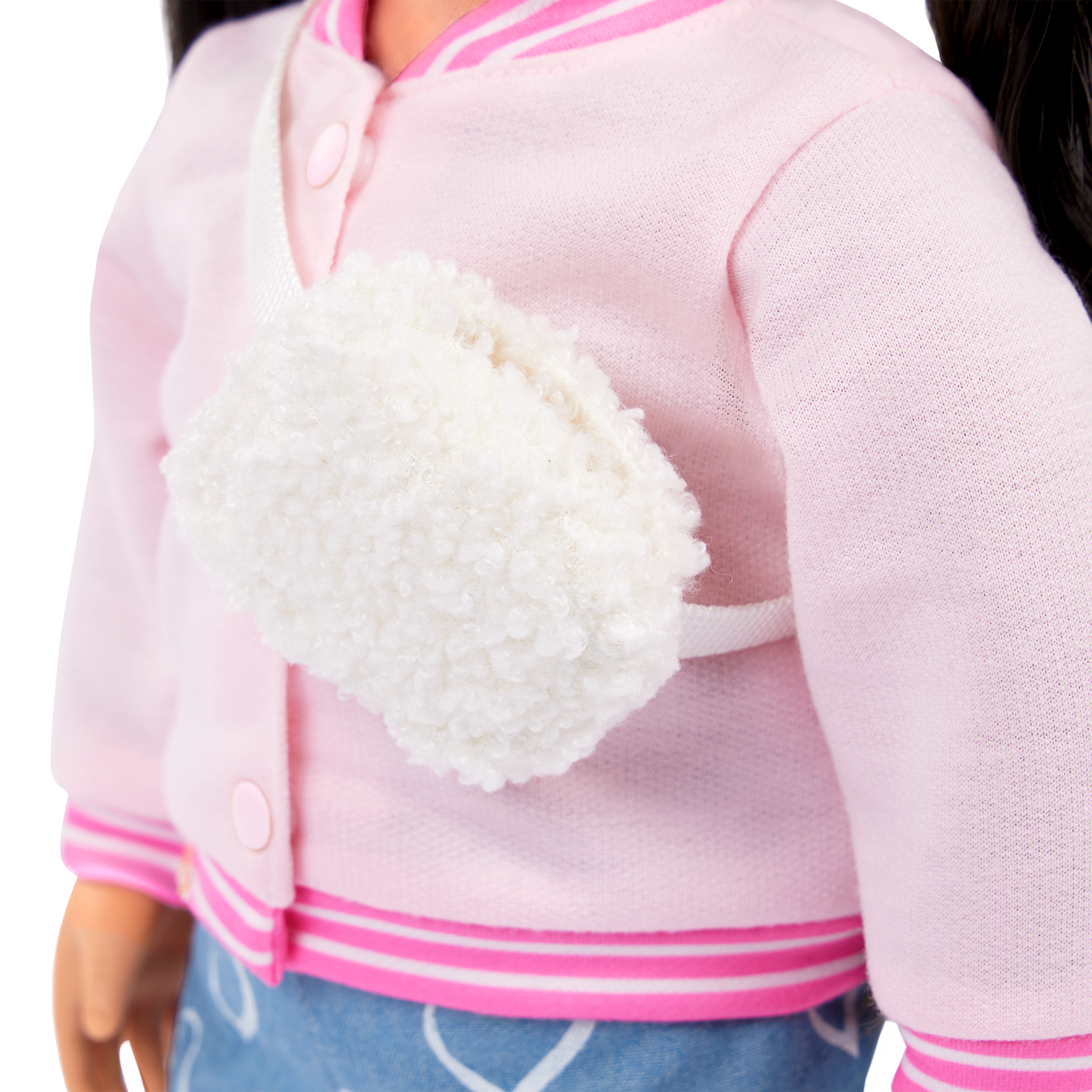 - Child-Friendly Design: Includes a tonal pink varsity jacket, a pair of denim-style pants with cute heart prints, a faux-shearling crossbody bag that doubles as a waist bag, and bright pink shoes.
