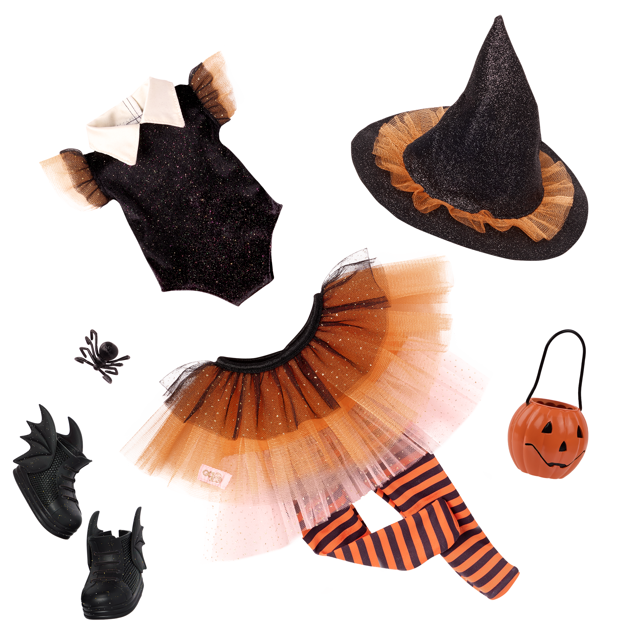 - Spooktacular Style: Just like those who dress up in their favorite costumes, Selene stands out as a whimsical witch featuring a sparkly hat, bat-winged shoes, a spider bracelet, and a pumpkin treat bucket—all beautifully accented in orange and black!