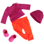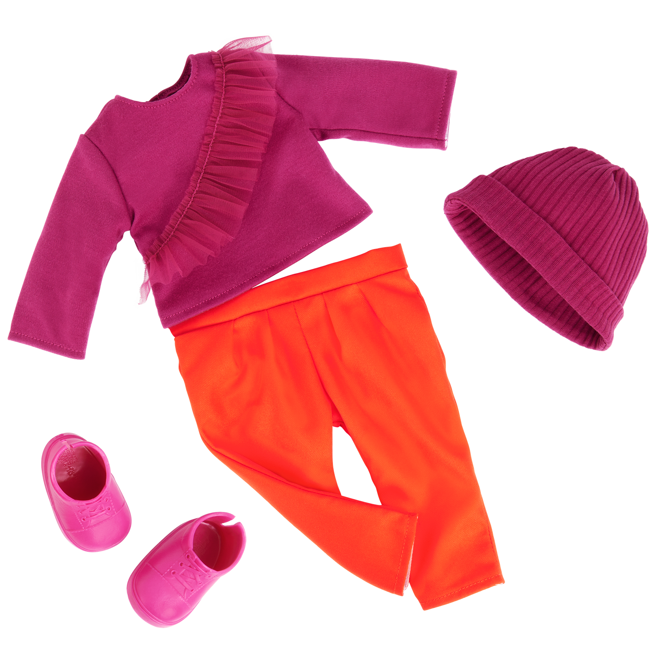 - Child-Friendly Fashion: Shay wears a fuchsia and orange color block outfit, including a top with cute ruffle tulle, a beanie hat, pants, a pair of undies, and shoes for a complete look.