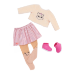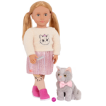 - Includes: 18-inch doll, fuzzy sweater, sparkly pink skirt, kitty-print leggings, pair of undies, bright pink shoes, 6-inch cat plush, a bow collar, 2 cans of food, a comb, fish toy, nail clipper, and a ball.