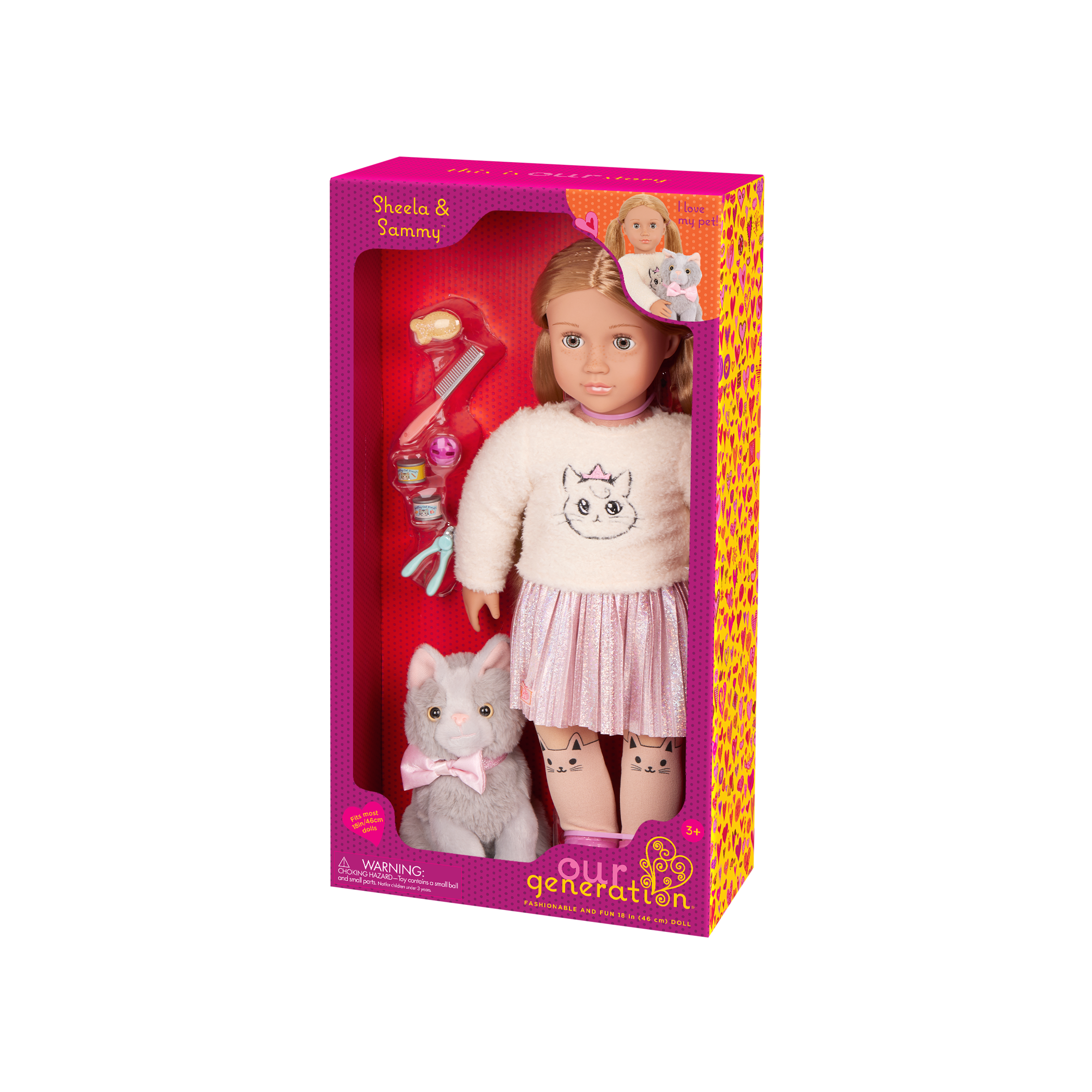 - 18-inch Doll & Pet Cat Plush: Our Generation 18-inch doll Sheela and her pet kitten Sammy make the purrfect team for kids to explore fun animal care with!