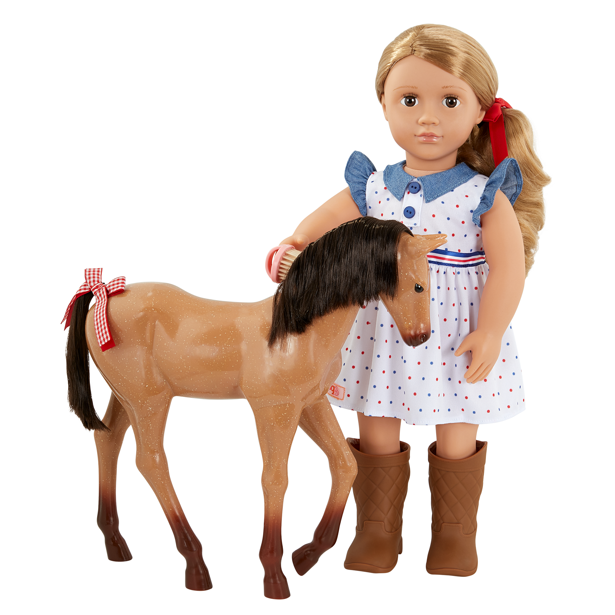 • Includes: doll, dress, hair bow, a pair of undies, boots, 12-inch foal with a sparkly coat, feeding bottle, grooming brush, foal hair bow, and carrot bunch.