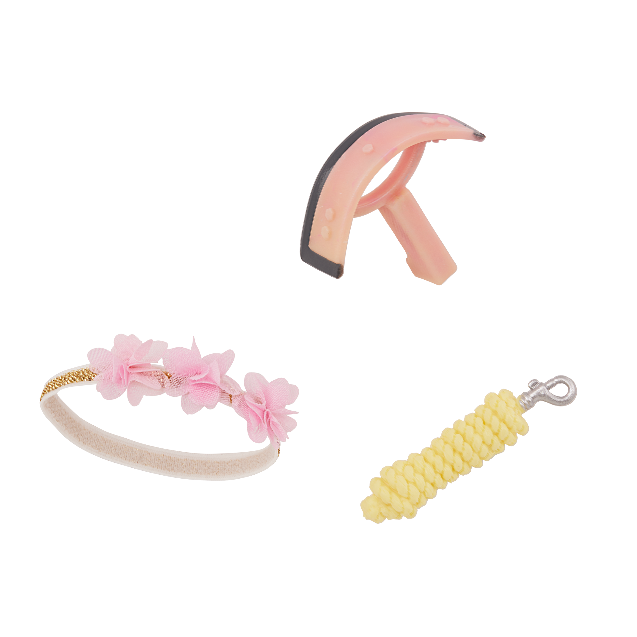 - Includes: Shetland pony, halter and lead, floral headband, confetti-print saddle pad, horse scraper, and rope.
