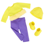 - Child-Friendly Fashion: Sola wears a bright yellow top with a cute faux fur trim, a beanie hat, purple pants, a pair of undies, and shoes