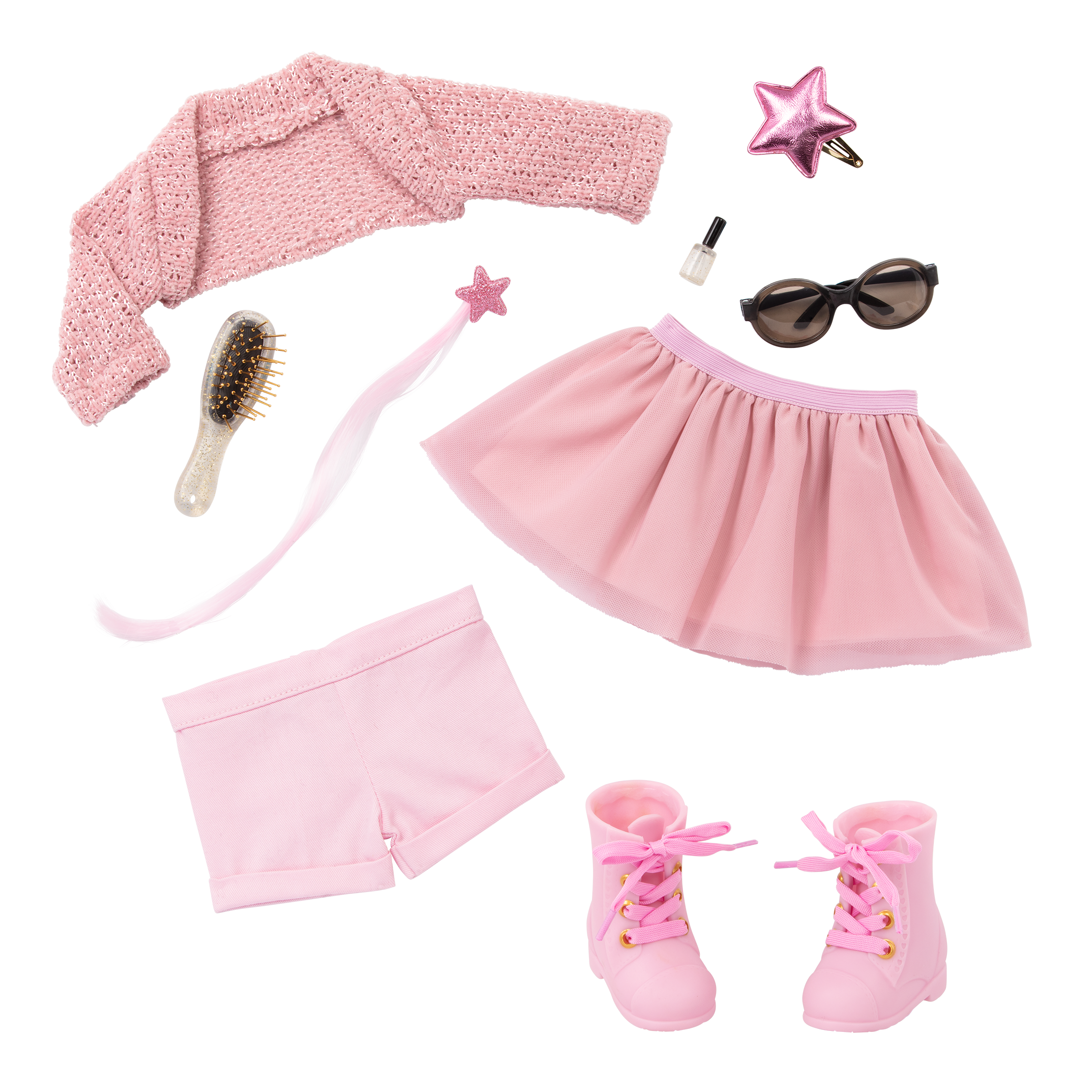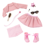 • Includes: doll, leotard, 2 skirts, shorts, tights, star hair clip, shoes, boots, cardigan, star purse, sunglasses, pretend nail polish, hairbrush, necklace, hair extension with glitter, and style guide.