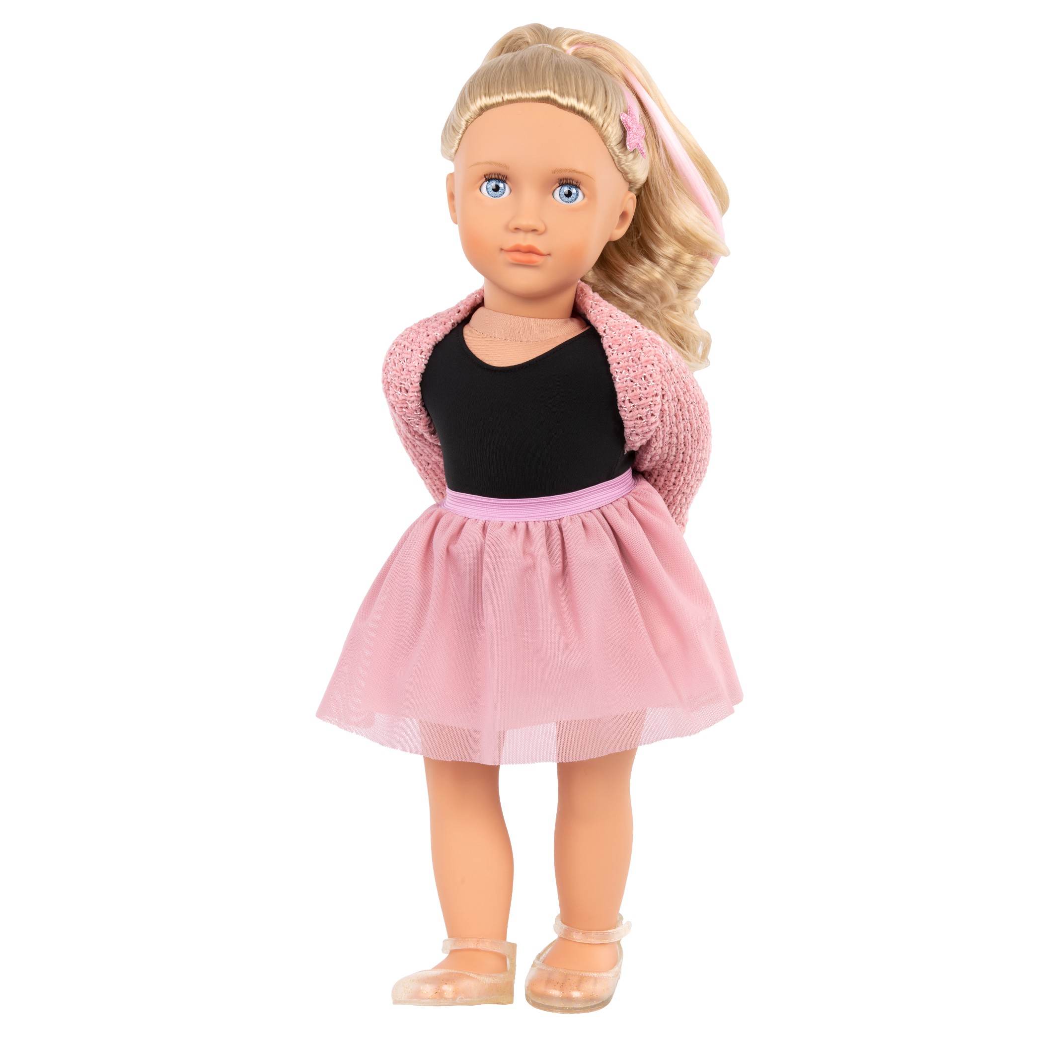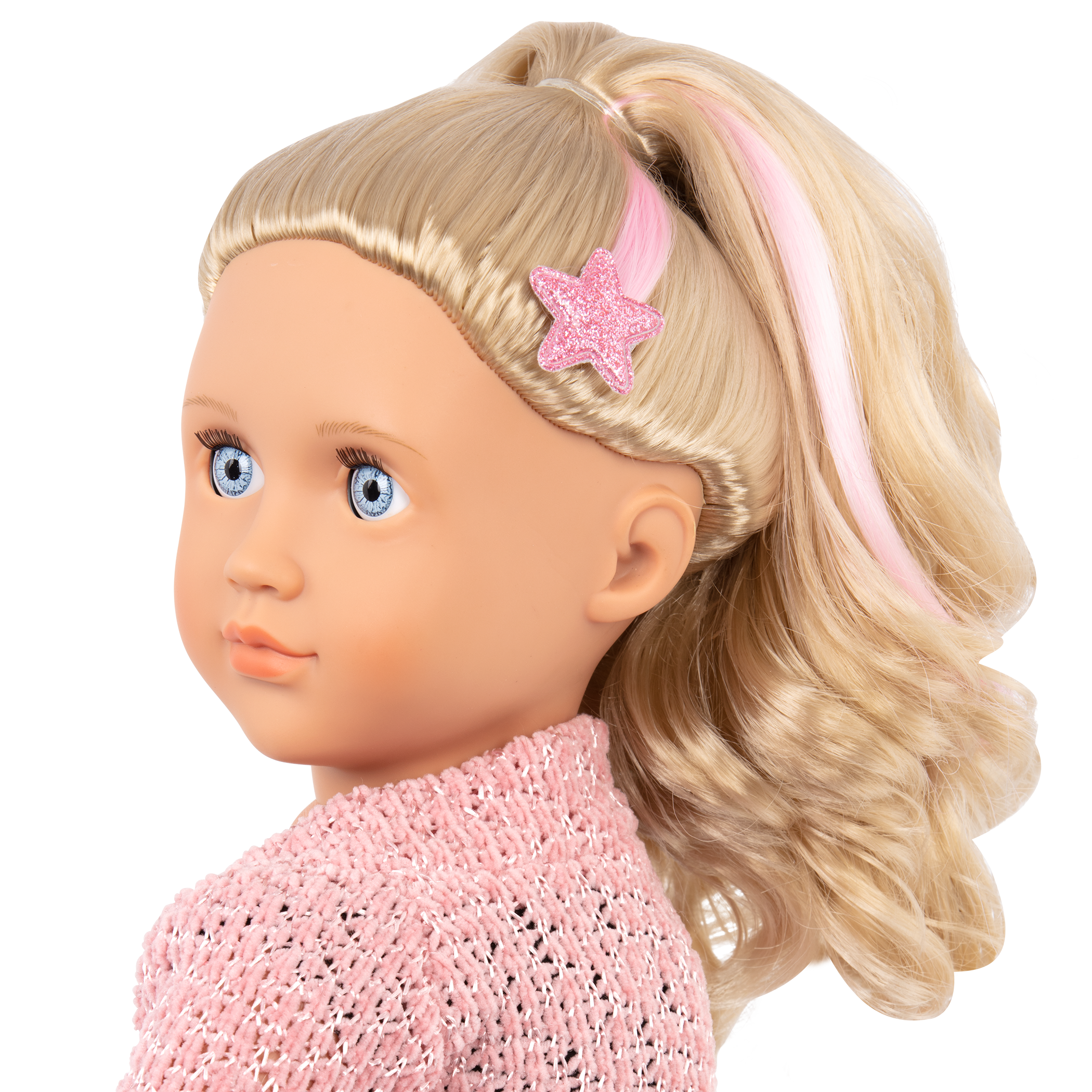 • 18-inch Doll: Stella has bright, sky-blue eyes that open and close with long, brushable blonde hair that’s fun to style and accessorize.