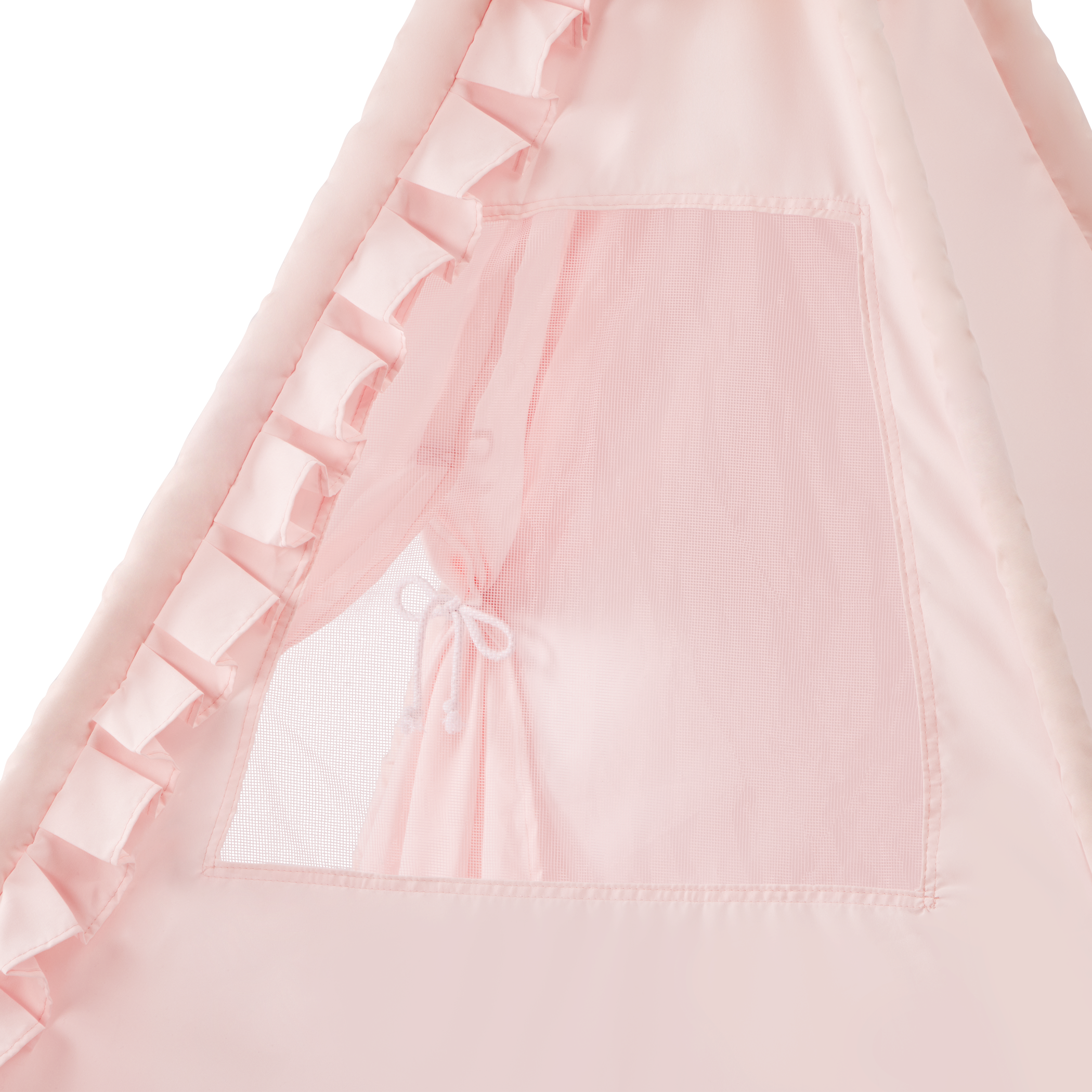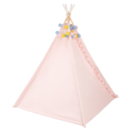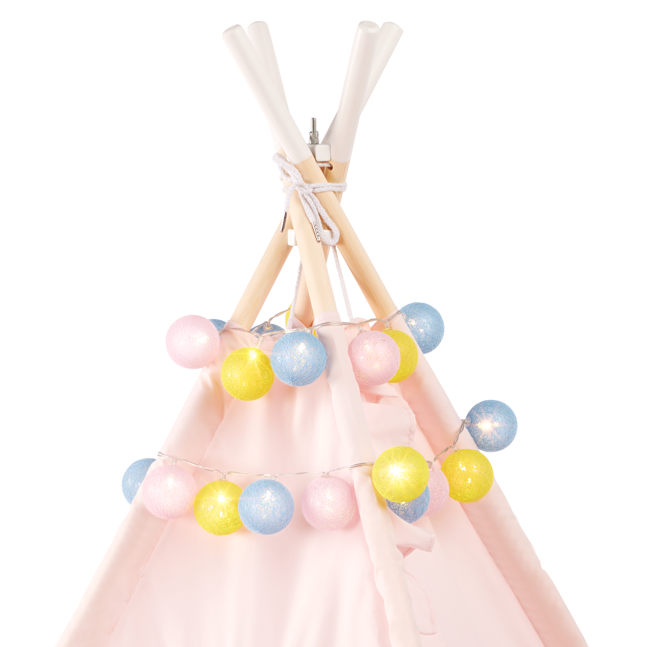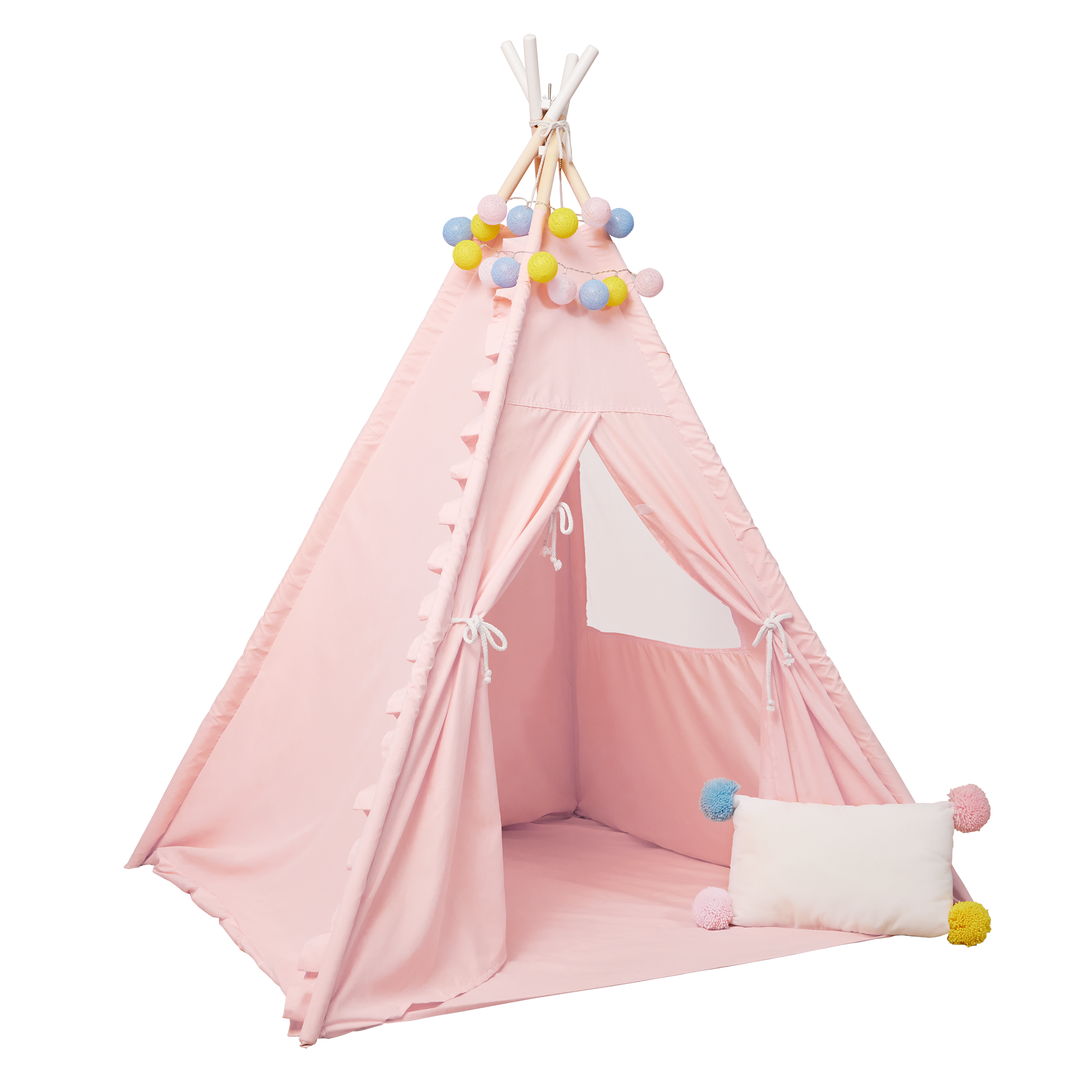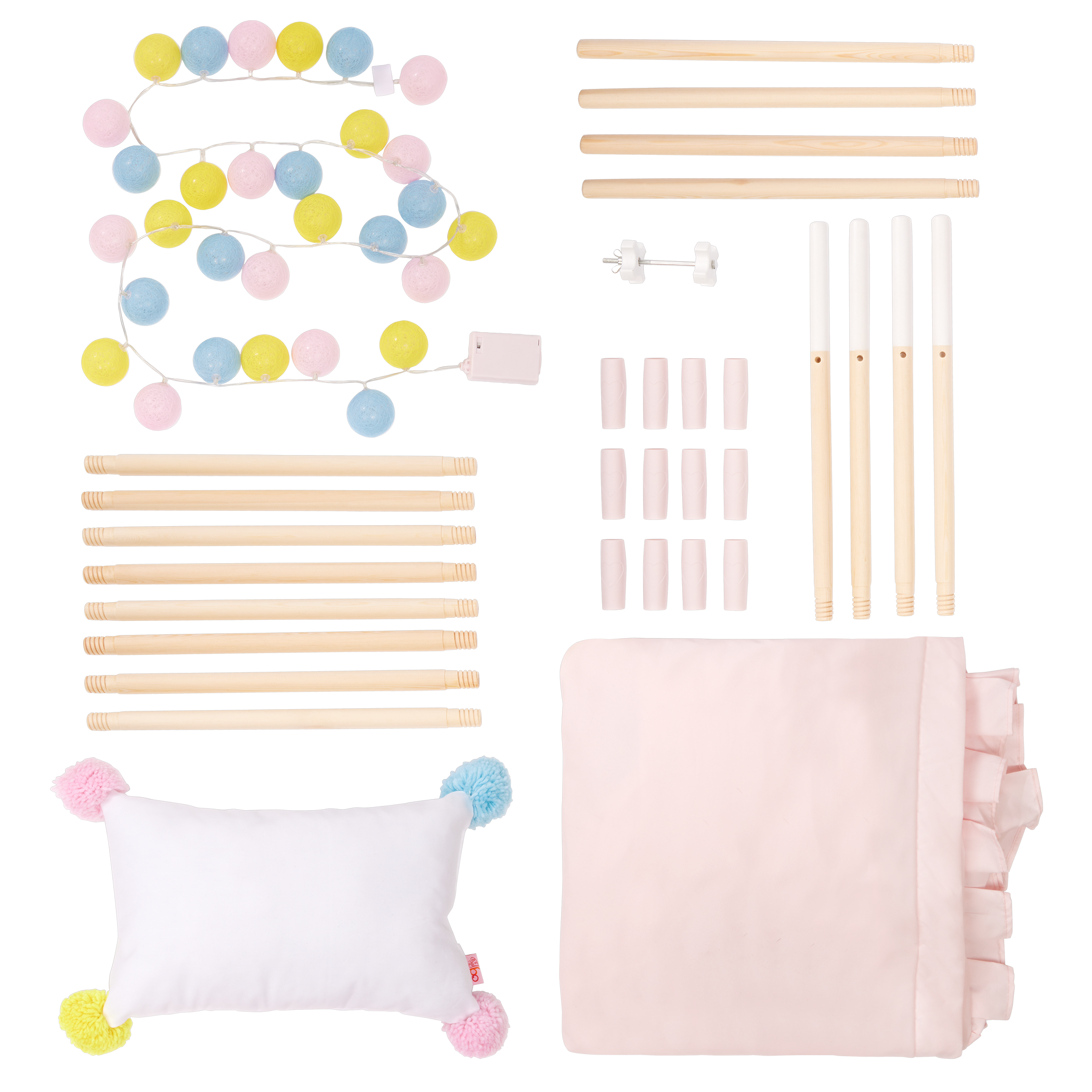- Includes: Pink play tent, 16 wooden tent poles, 12 connectors, a pillow, a string of lights, and an anti-collapse kit.