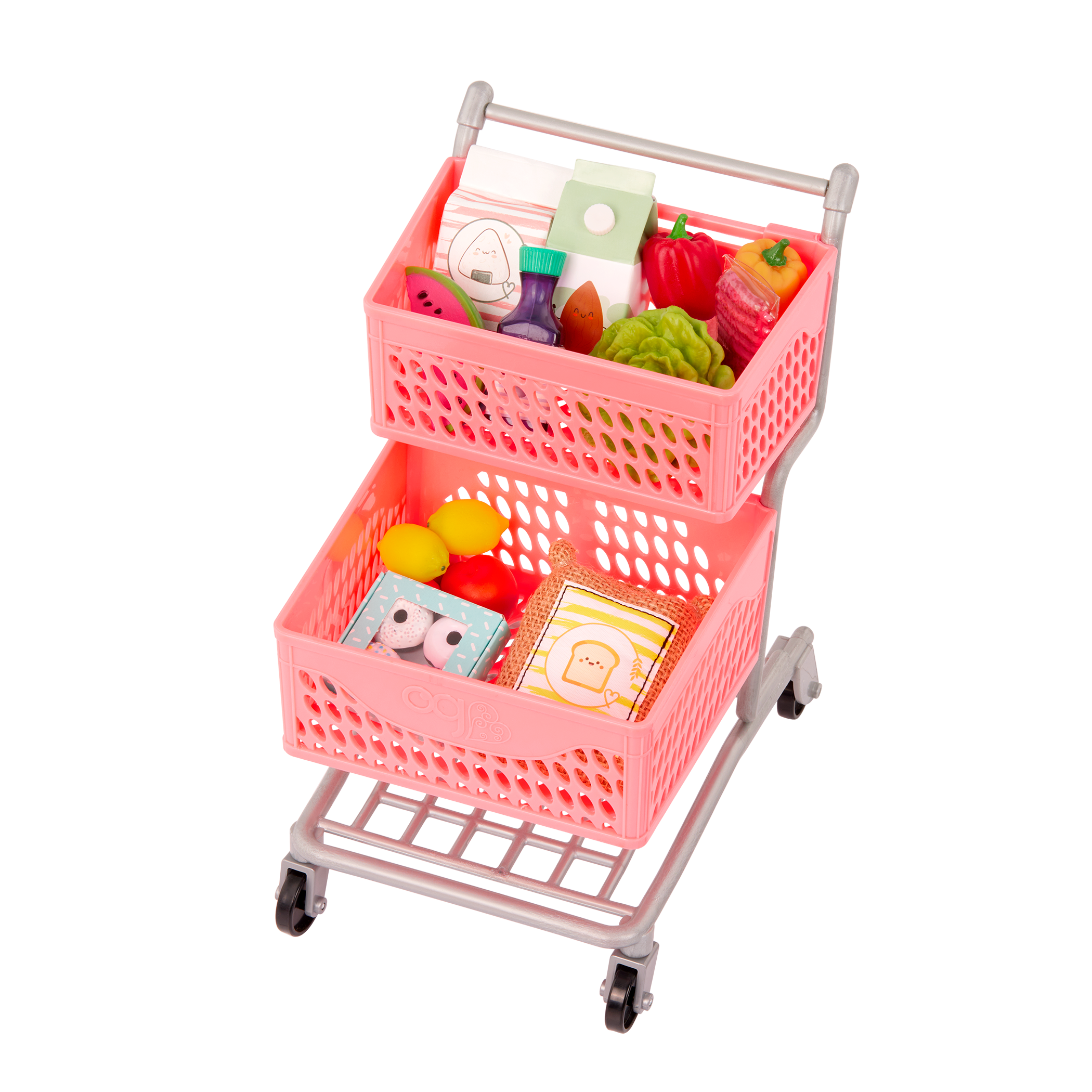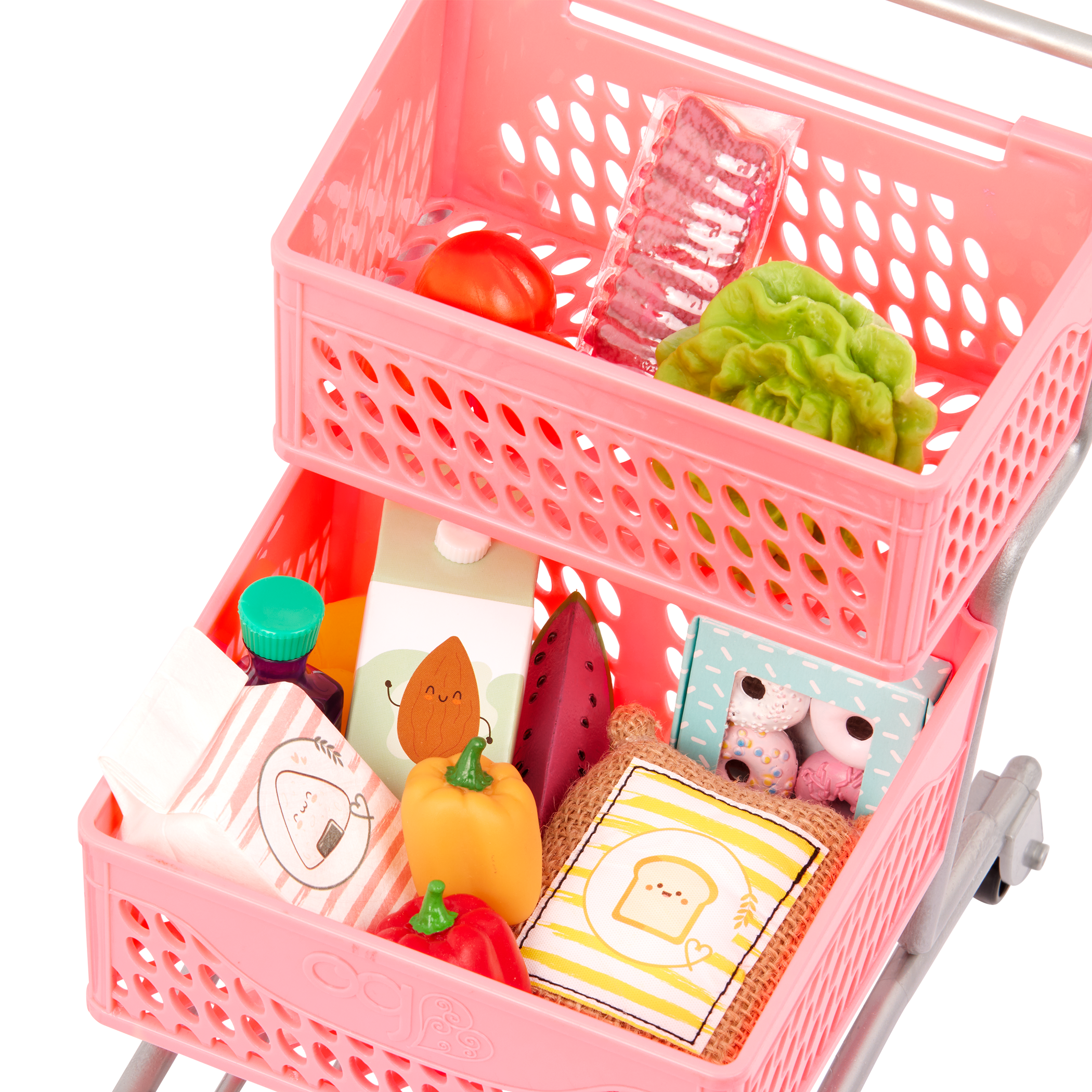 - Includes: A doll grocery cart, a bag of flour, a rack of ribs, lettuce, almond milk, a cluster of peaches, 2 peppers, 2 lemons, a slice of watermelon, a bag of rice, grape juice, and a box of 4 donuts.