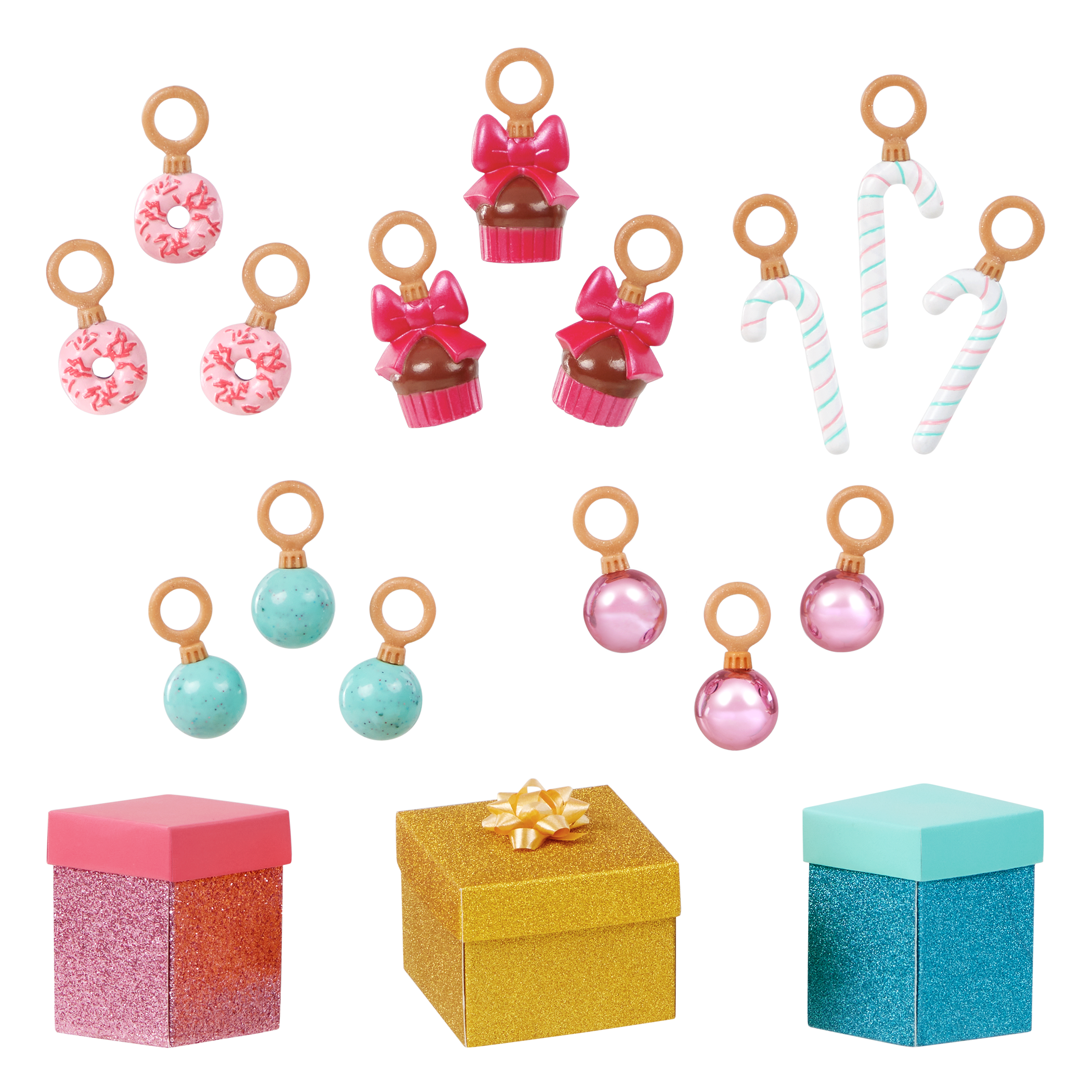 - Includes: The Christmas tree comes with an attached tree topper, tree base, 15 tree ornaments, 3 surprise gift boxes, a candy-themed hair clip, a doll necklace, and 2 sticker sheets.