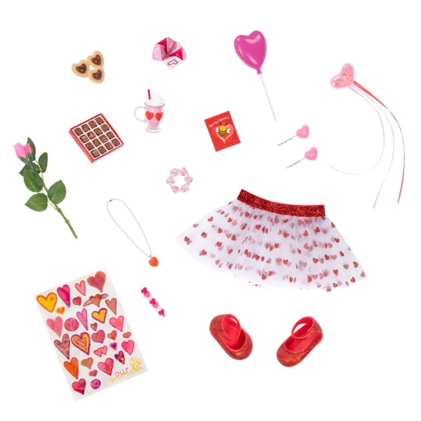 - What’s Inside: Includes a heart-print skirt, real stickers, 3 heart-shaped hair clips, a rose, a box of chocolates, a doll-sized Valentine’s Day card, a pen, a paper fortune teller game, hot chocolate, pretend cookies, a balloon, jewelry, and shoes.