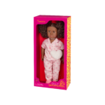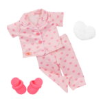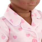 - Includes: Doll, pink flannel-style pajamas decorated in mini hearts with button-down top, a pair of undies, bright pink slippers, and a plush heart-shaped pillow.
