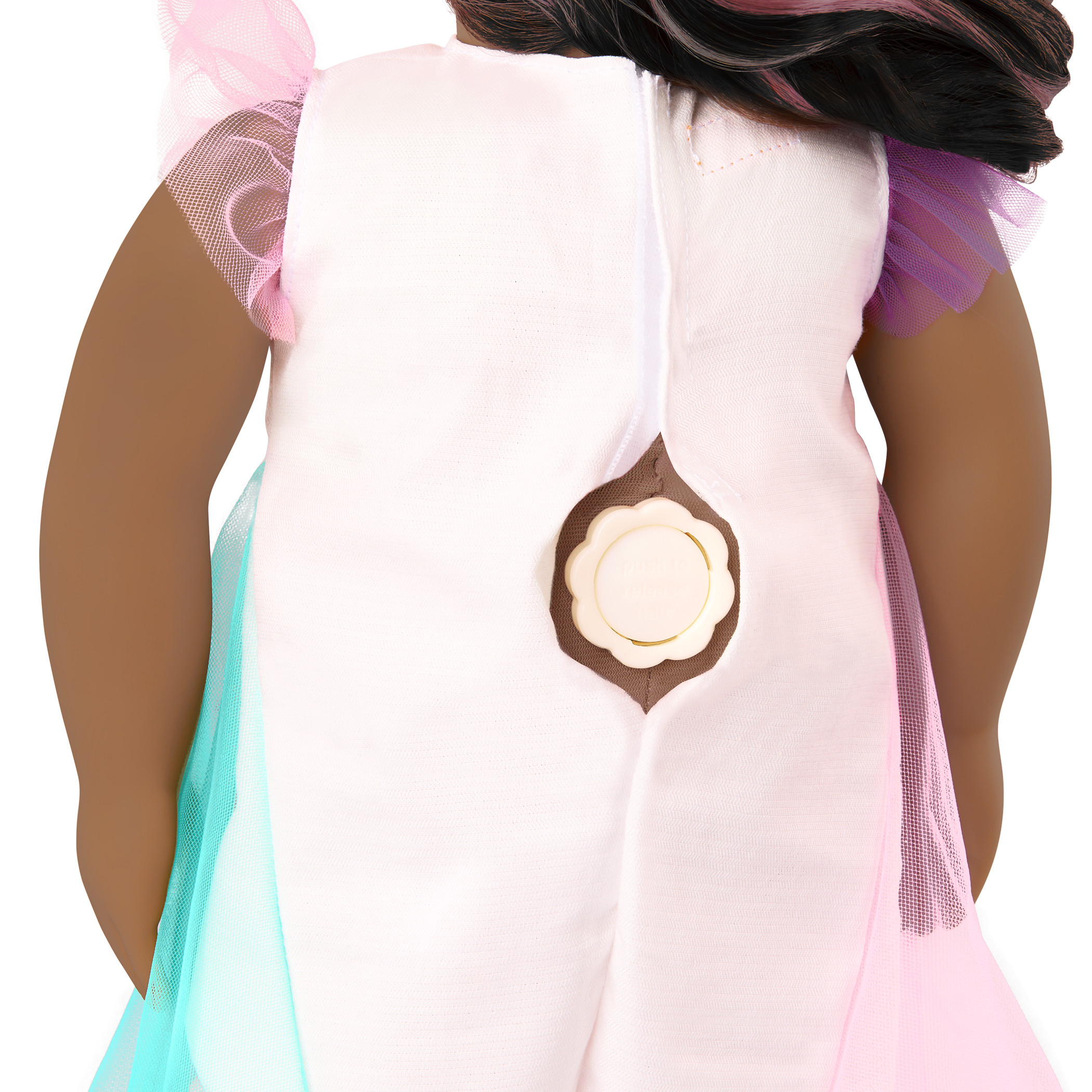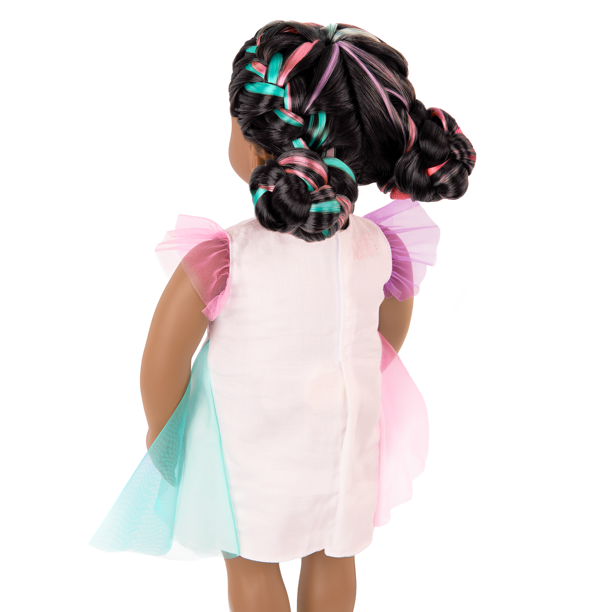 • Includes: 18-inch doll, a cute dress with rainbow tulle, a pair of undies, casual shoes, a comb, 2 hair extensions, 2 heart-shaped hair clips, and a step-by-step styling guide to create 4 beautiful looks.