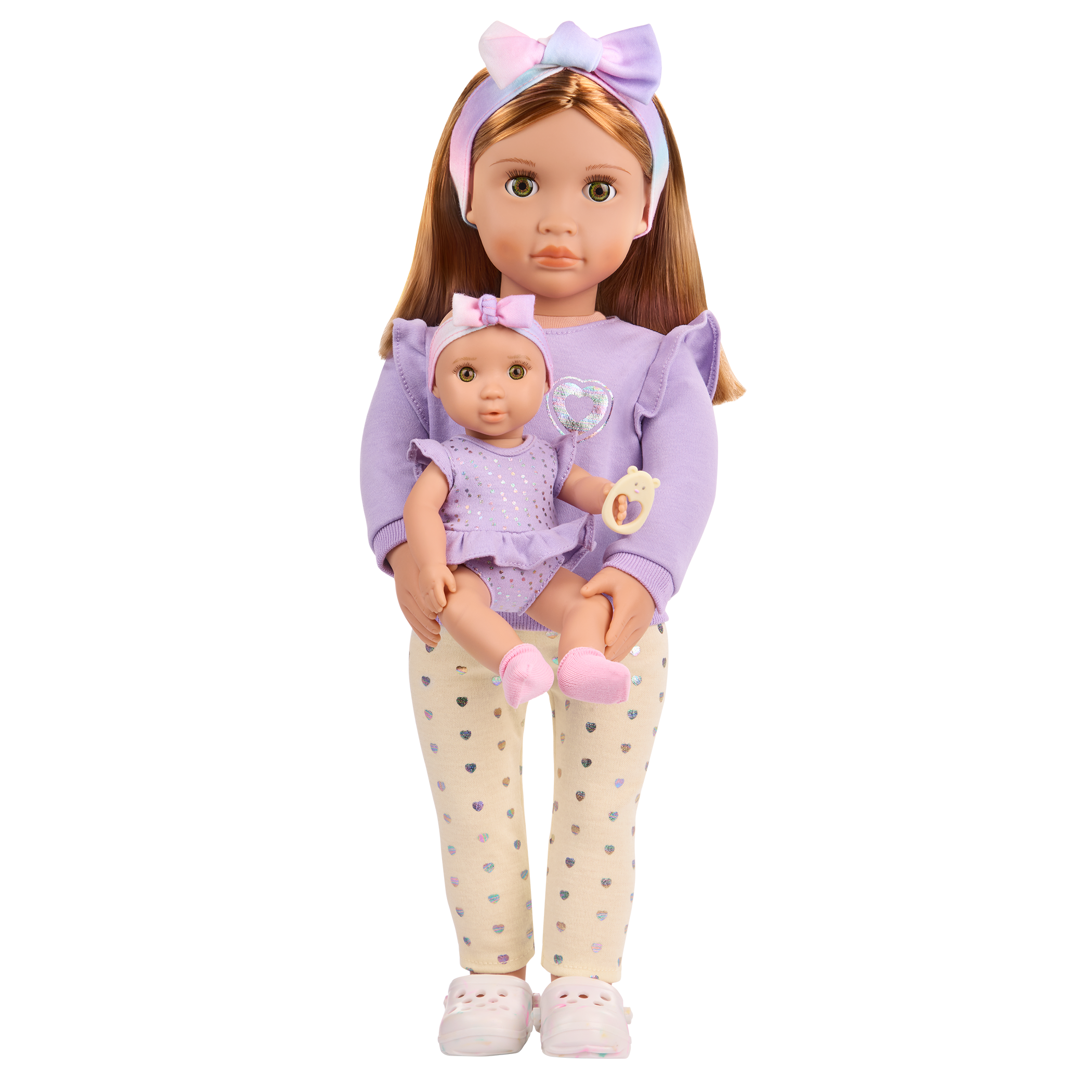 • Includes: 18-inch doll Tory, 8-inch baby doll Riley, 2 headbands, a sweater, a pair of undies, leggings, shoes, a baby doll onesie, a pair of socks, a pacifier, a bib, a baby bottle with a removable top, a blanket, a teether, and a 5-piece stacking toy.