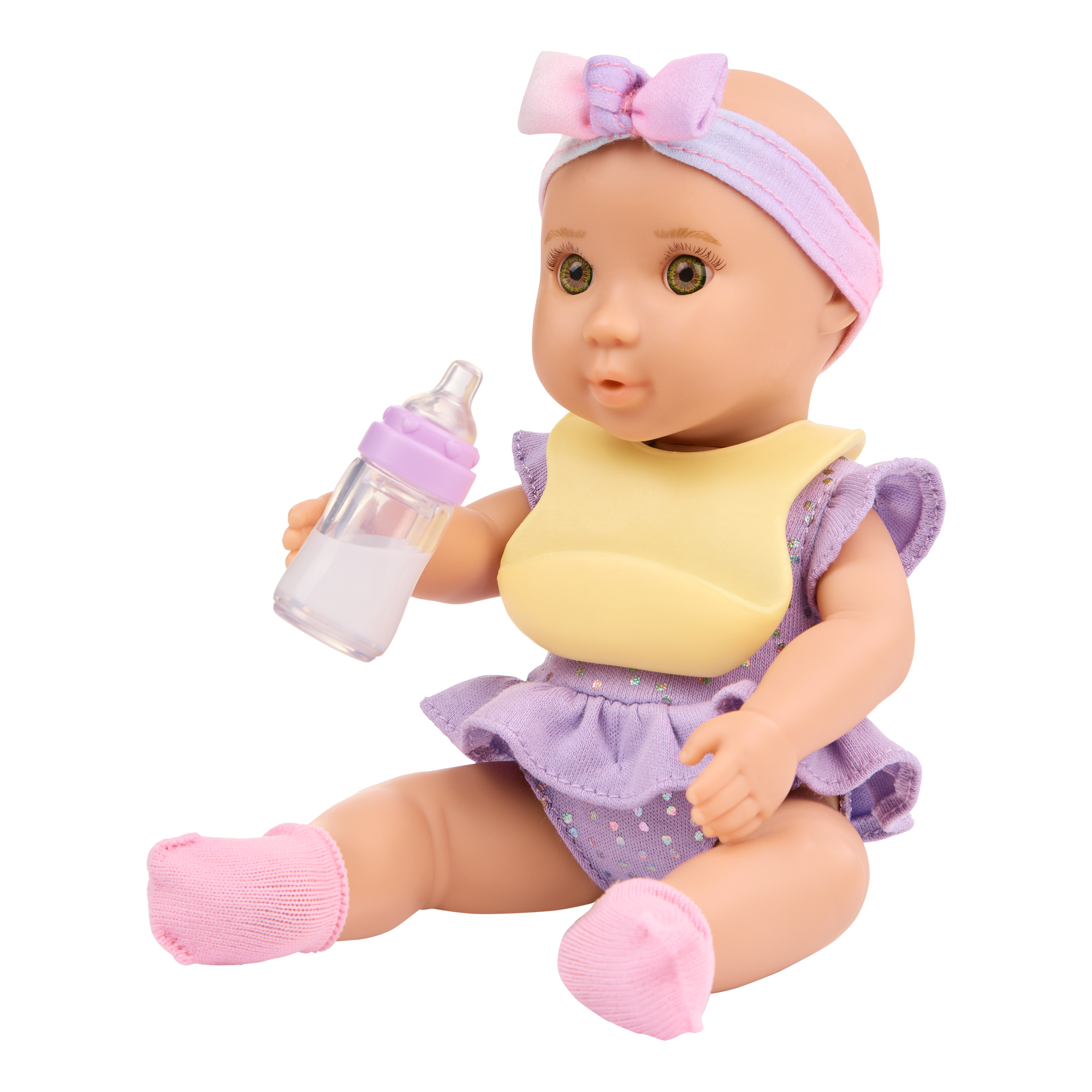 • 8-inch Baby Doll: Riley’s expressive hazel eyes and sculpted hands and feet will delight little ones during role-play. Plus, the pacifier fits in her mouth to mimic gentle soothing.