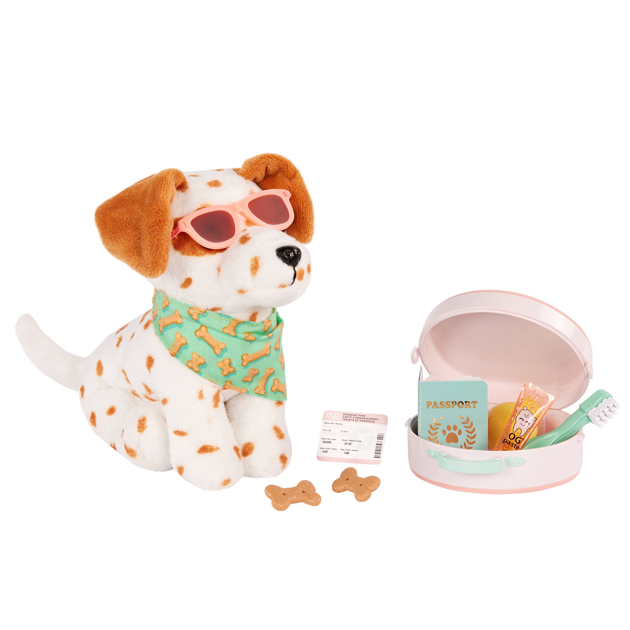 - Includes: 6-inch Lemon Dalmatian dog plush, carry-on luggage, a bandana with dog bone prints, sunglasses, a passport, a boarding pass, a toothbrush, a tube of toothpaste, 2 dog treats, and a toy ball.