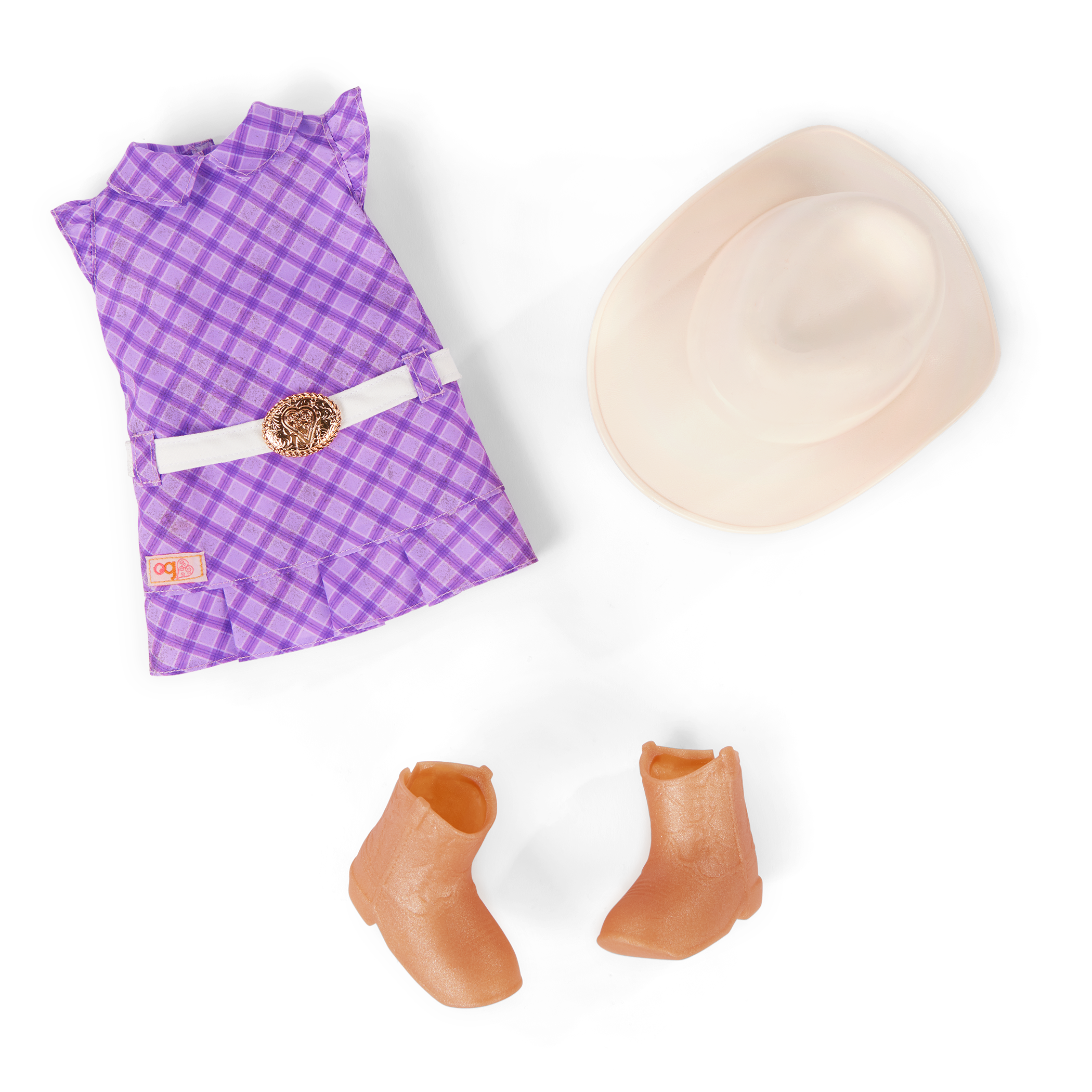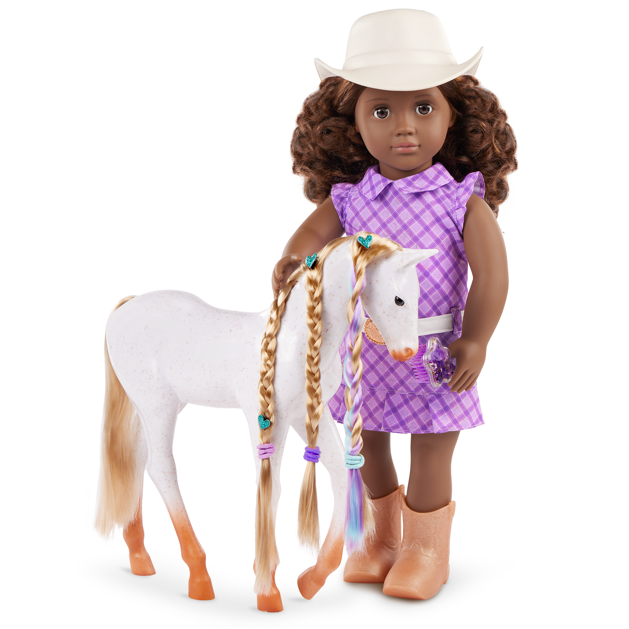 • Includes: 18-inch doll, a cowgirl hat, a plaid dress, a pair of undies, tall boots, a foal, a hair extension, 3 hair elastics, 3 hair charms, and a comb.