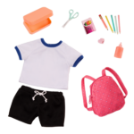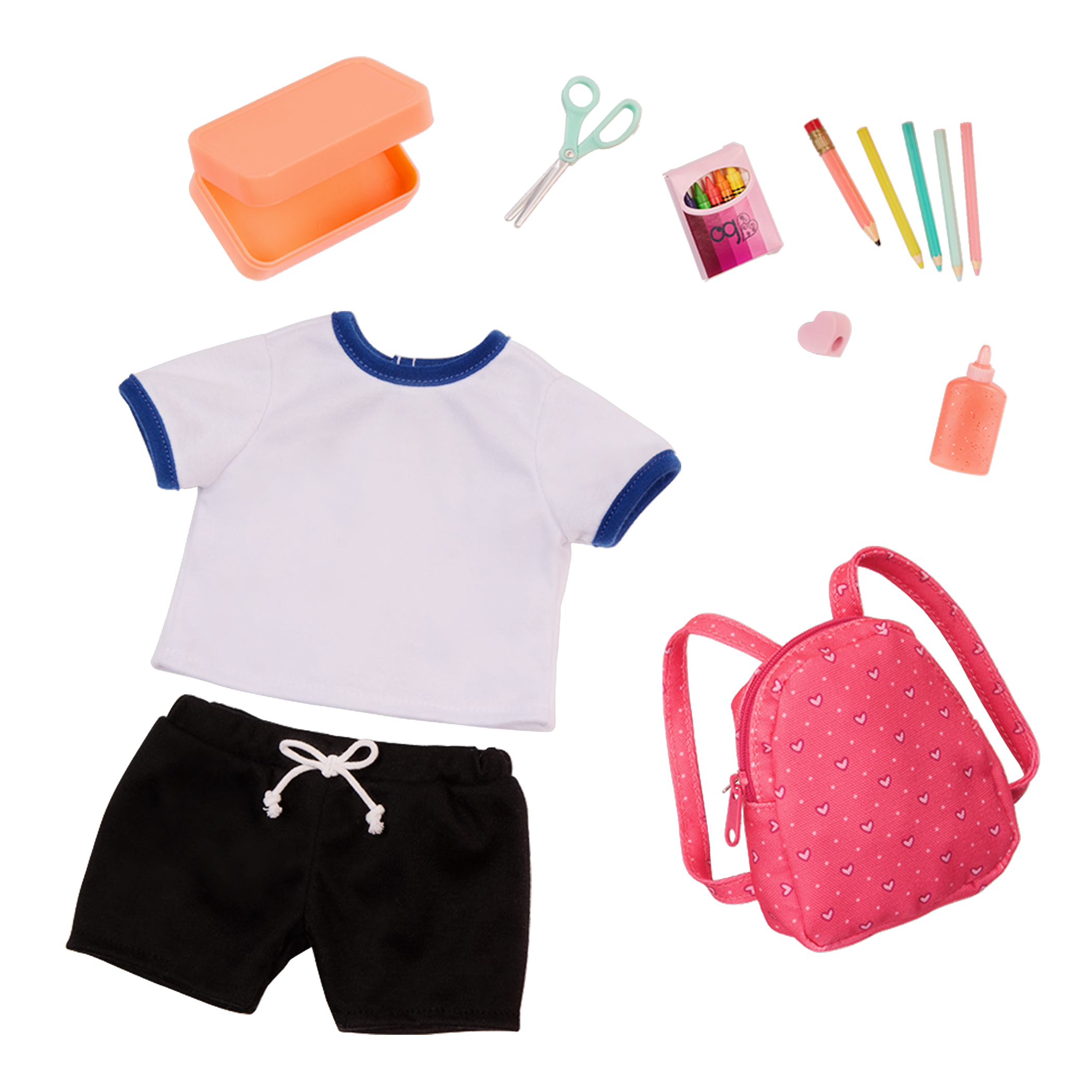 • Outfits & Pretend School Supplies: Virginia comes with 2 tops, a shiny skirt, shorts, a pair of undies, shoes, tall socks, a backpack, pencil case, pencil, eraser, a box of 6 crayons, 4 coloring pencils, scissors, bottle of glue, storybook, and bookmark.