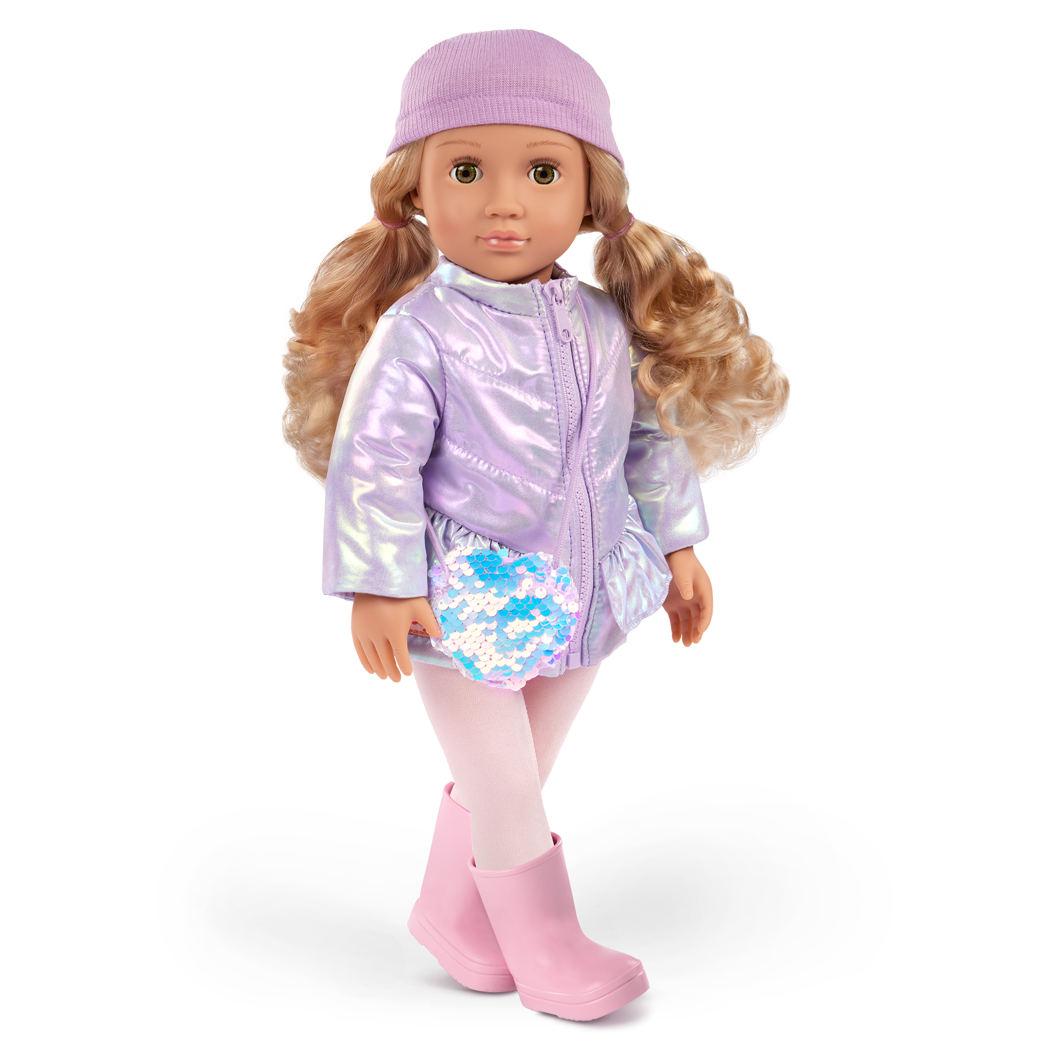 - Child-Friendly Design: Includes a zip-up metallic puffer coat with cute ruffle details, a beanie hat, a shimmery heart-shaped sequin purse, and tall boots to dress their doll from head to toe.